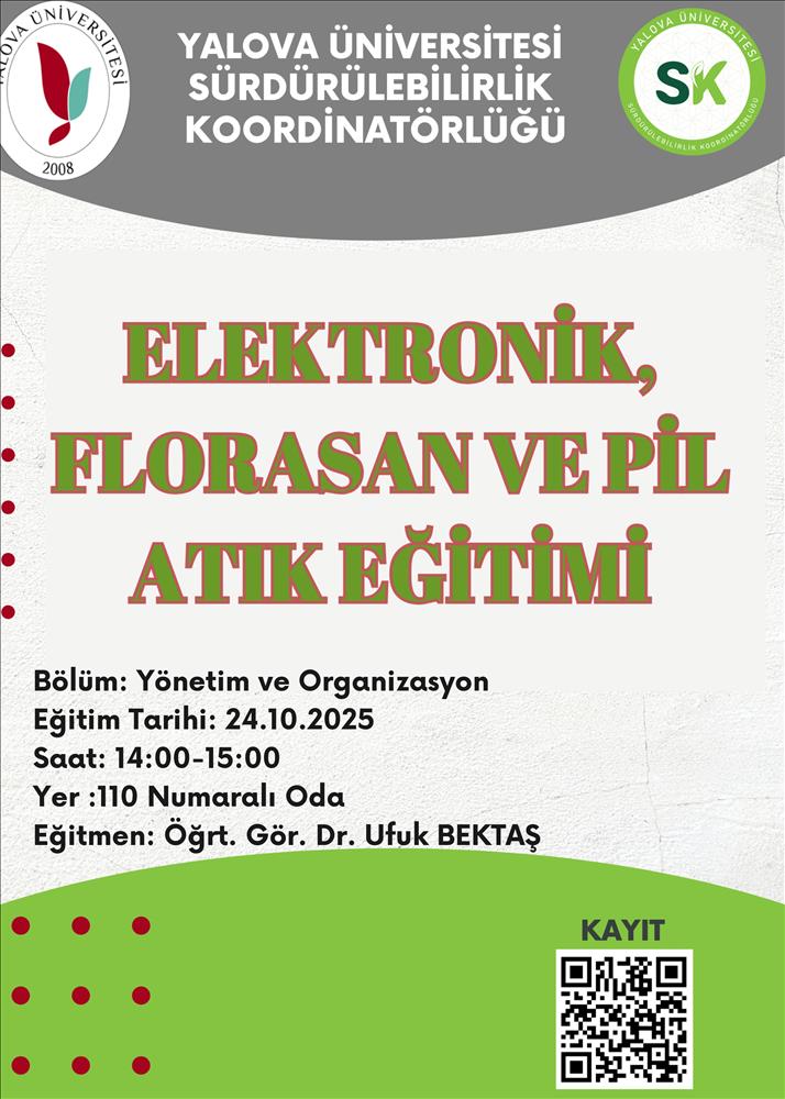 Bölüm Sürdürülebilirlik Koordinatörü Öğr. Gör. Dr. Ufuk BEKTAŞ tarafından 24 Ekim 2025 Tarihlerinde bölümümüz öğrencilerine yönelik Sürdürülebilirlik Eğitimleri kapsamında Elektronik, Florasan ve Pil Atık Eğitimi verilecektir.