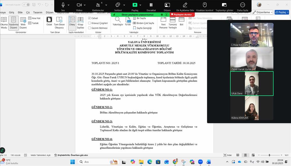 Yalova Üniversitesi Armutlu Meslek Yüksekokulu Yönetim ve Organizasyon Bölümü tarafından, eğitim-öğretim faaliyetlerinin kalitesini artırmak ve sürekli iyileştirme süreçlerini değerlendirmek amacıyla Bölüm Kalite Komisyonu Toplantısı gerçekleştirildi.